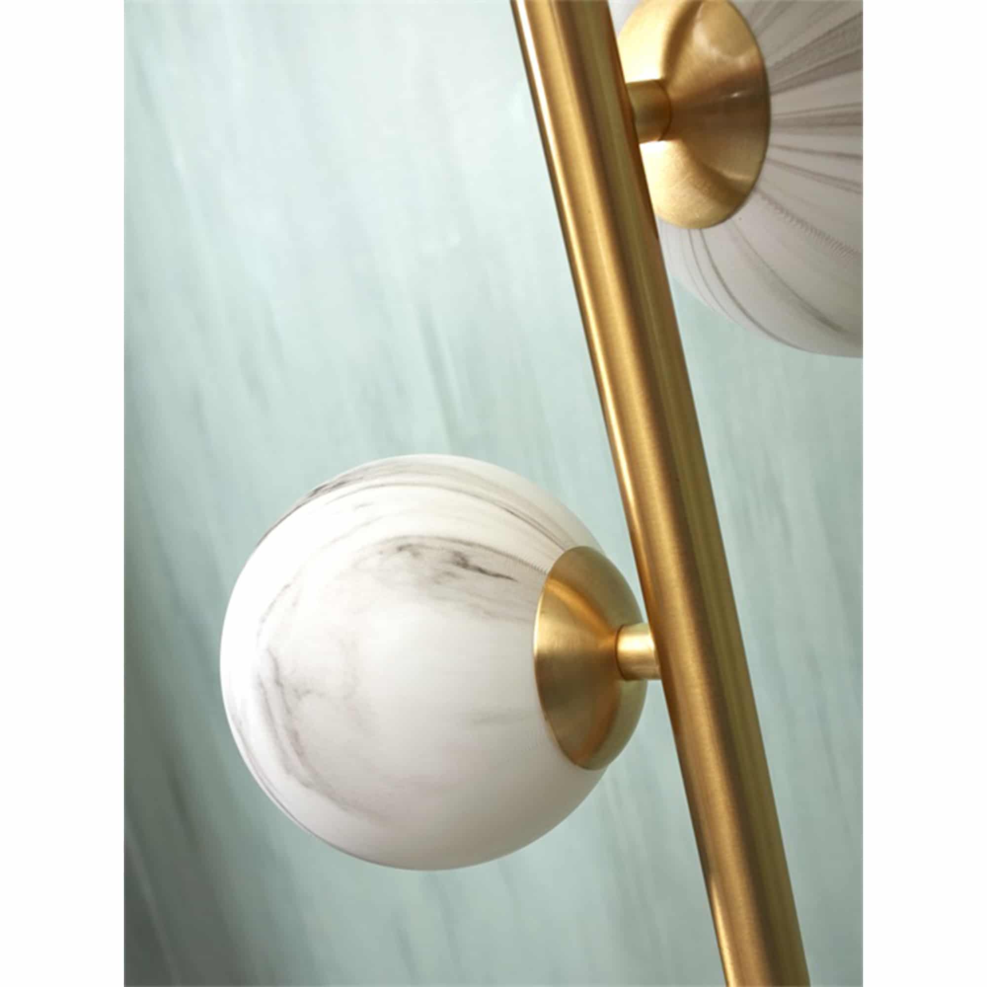 Lampa podłogowa Carrara — projekt marki z Holandii It’s About Romi, mierzy 159 cm. Składa się z minimalistycznej konstrukcji, zakończonej trzema okrągłymi kloszami o modnym, kamiennym wzorze. Szklane kopuły skierowane są w różne strony, dzięki czemu Carrara oświetla całe wnętrze.