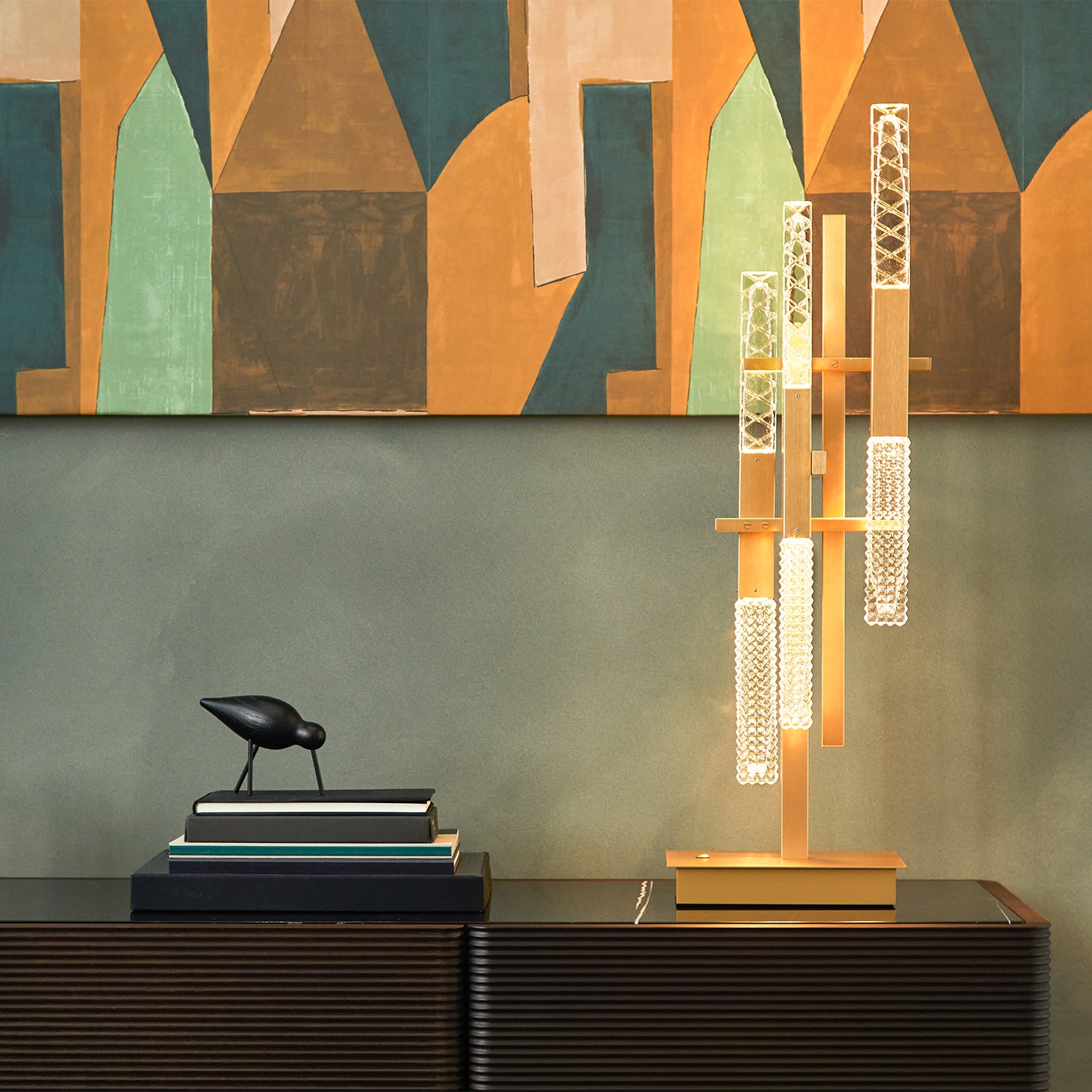 Lampa, która wygląda jak błyszczący klejnot? Oto Mikado – lampa stołowa marki Contardi. Włoscy projektanci stworzyli niezwykłe dzieło sztuki, na które składają się prostokątne rurki w kolorze satynowego mosiądzu oraz klosze z grawerowanego kryształu. Wysokość to aż 86 cm! Ta lampa na pewno przyciągnie uwagę Twoich gości.